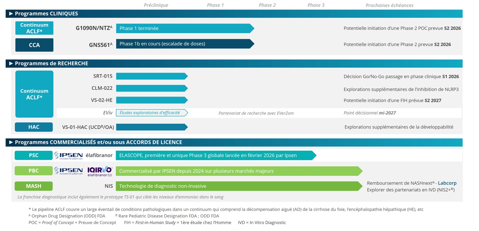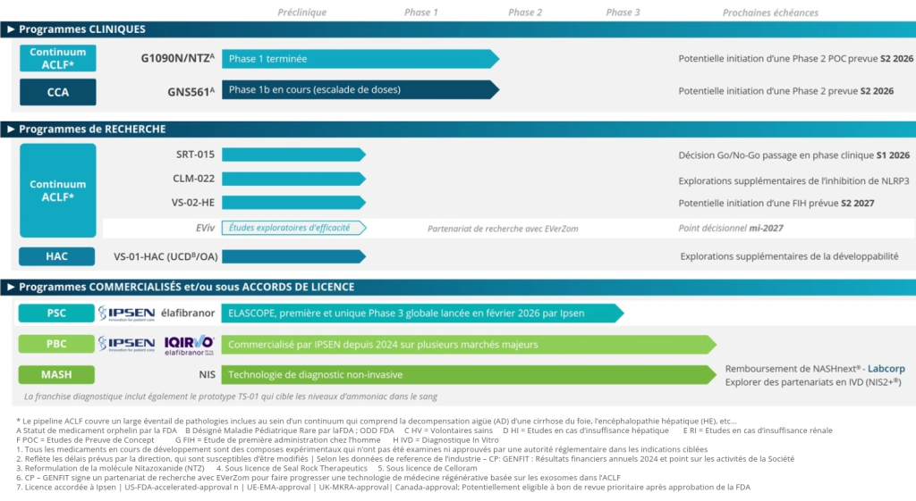 Aujourd’hui, GENFIT cible la décompensation aigüe sur cirrhose (Acute on-Chronic Liver Failure – ACLF), ainsi que les pathologies associées comme la décompensation aiguë (DA) ou l’encéphalopathie hépatique (EH). Elle développe des actifs thérapeutiques aux mécanismes d’action complémentaires, choisis pour cibler les voies physiopathologiques clés.
